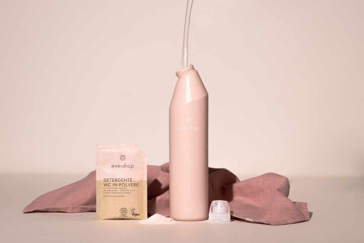 Prendi il flacone di everdrop, riempilo d’ acqua calda e aggiungi la polvere per WC. Poi agita vigorosamente: il detergente è pronto!